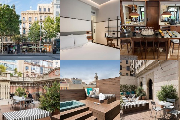 This stylish hotel is found two minutes from Plaça Catalunya and has a rooftop pool and a terrace.